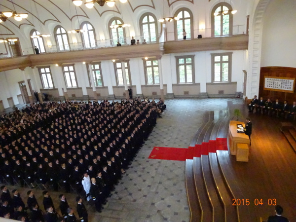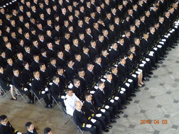 幹部候補生たちは、1人ひとりの名前が呼ばれると力強く返事をして起立、武居智久海上幕僚長や杉本孝幸幹部候補生学校長等からの訓示や祝辞等に真剣に聞き入っていました。