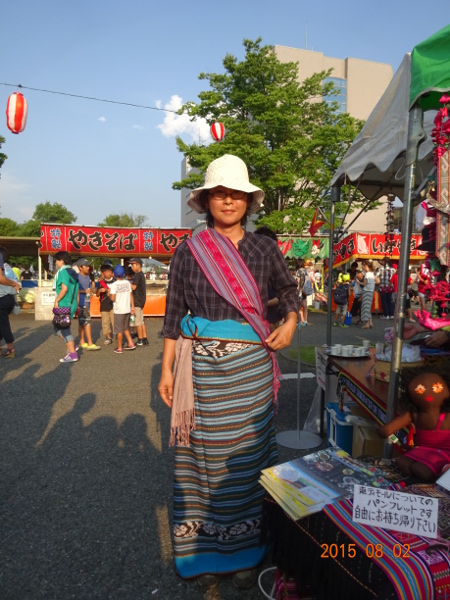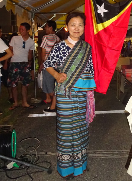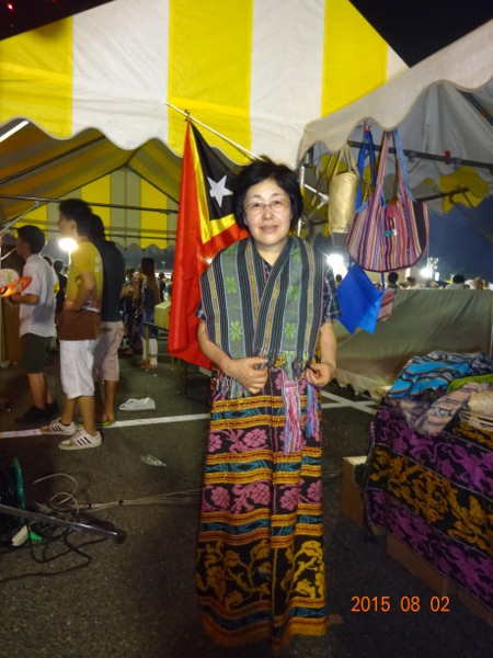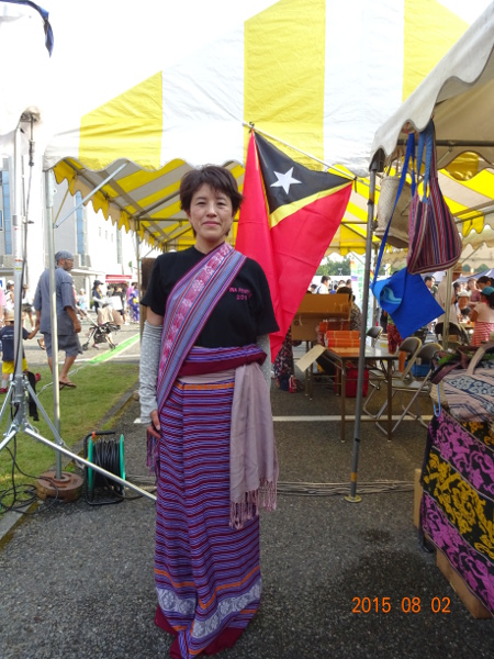 その中に、東ティモールの国旗を掲げた東ティモールのブースが登場しました。東ティモールの子供たちの笑顔の写真、伝統織物のタイスや人形など様々な東ティモール産品を展示等しました。また、女性の皆さんには、伝統衣装の試着にもトライして頂きました。