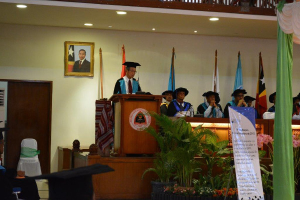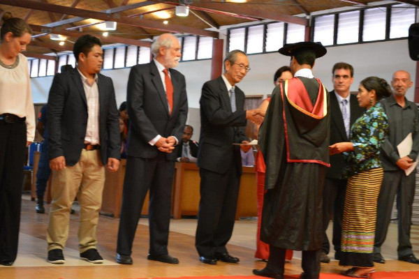 東ティモール国立大学工学部の能力向上プロジェクトのチーフアドバイサーである風間秀彦先生(元埼玉大学教授)は、12月10日に行われた同大学工学部の 卒業式典の席上、Aurerio学長から、同大学工学部の能力向上に長年尽くされて来られたご功績を高く評価され、日本人として初めて感謝状を受けられました。