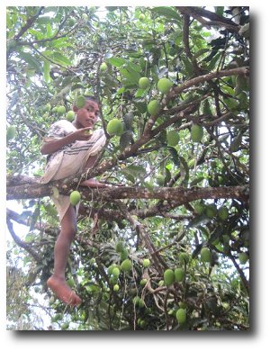 以前パパイアの木、今度はマンゴーの木に登って(登らされて)実を収穫する弟。この写真で、マンゴーの大豊作、わかっていただけるでしょうか?
