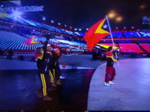 同選手は、東ティモール国旗を掲げ、役員の皆さんと開会式に臨み、にこやかに堂々の入場行進をしました。