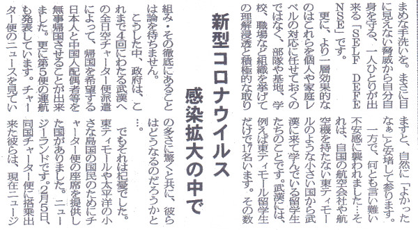投稿日: 2020年2月15日2020年6月18日 投稿者: 日本東ティモール協会「防衛ホーム」紙の「ノーサイド」欄へ「新型コロナウイルス感染拡大の中で」が掲載されました 「新型コロナウイルス感染拡大の中で」pdf