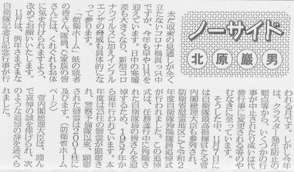 「防衛ホーム」誌の「ノーサイド」欄に「自衛隊記念日に」
