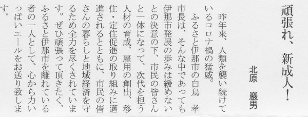 投稿日: 2021年4月13日 投稿者: 日本東ティモール協会伊那市広報誌「伊那市ふるさとだより」第25号(2021年3月号)に「頑張れ、新成人!」が掲載されました 伊那市広報誌「頑張れ、新成人!」全文pdf